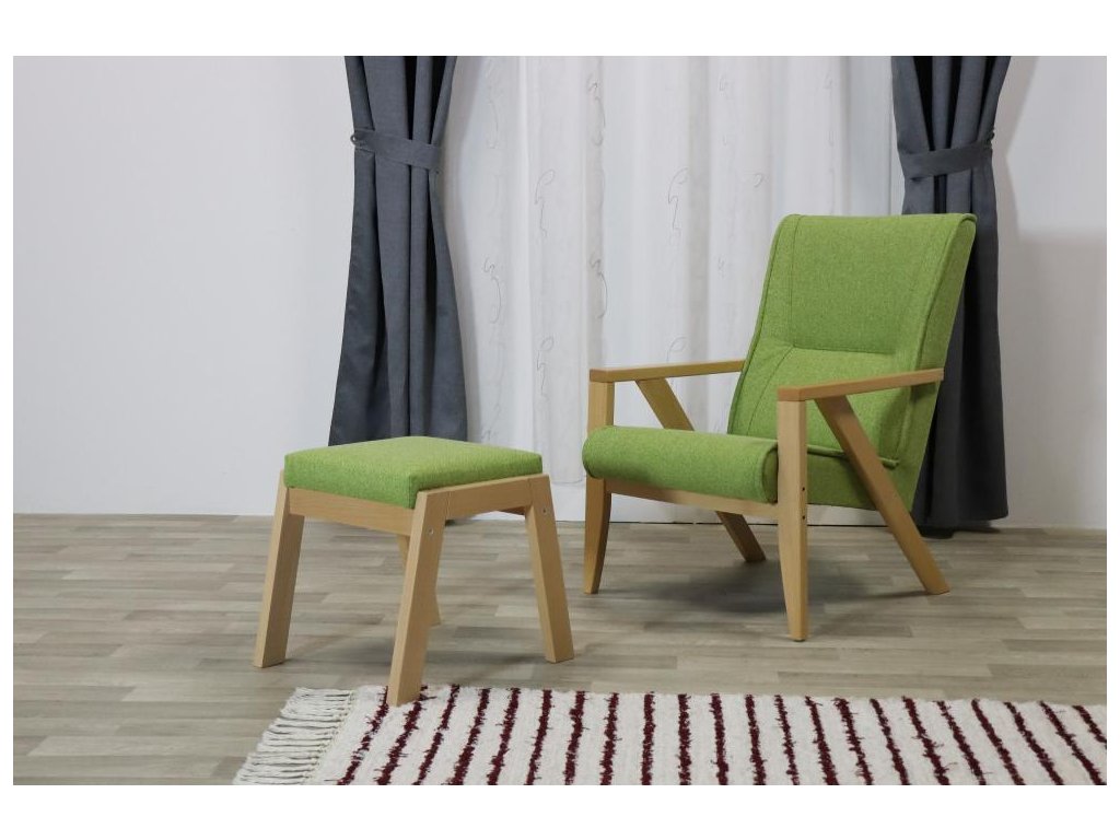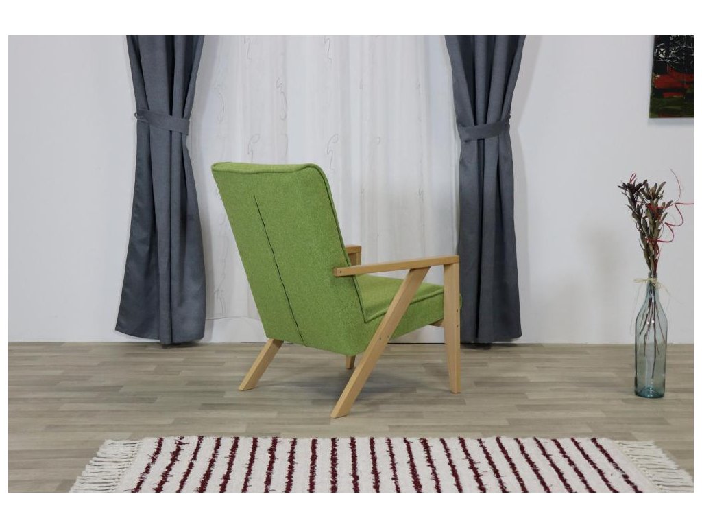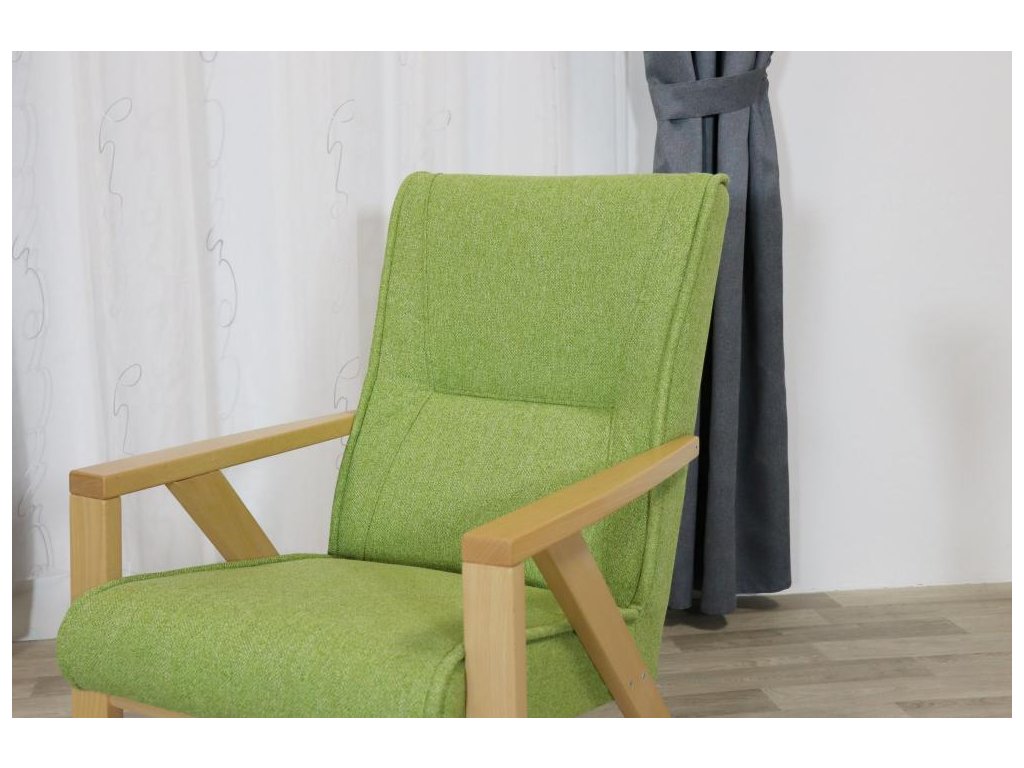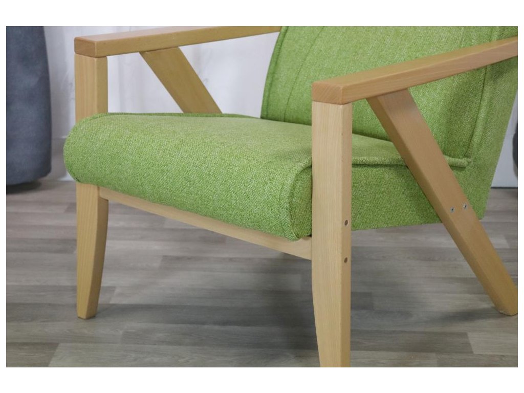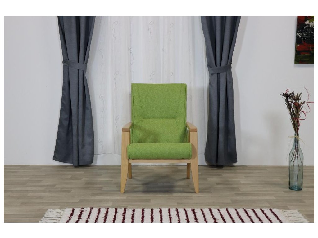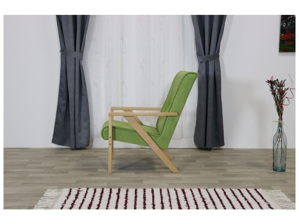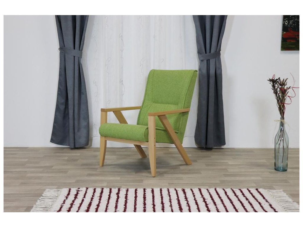 Lehké relaxační čalouněné křeslo s dřevěnou podnoží. Křeslo je vhodné pro domácí použití, hotely, penziony, ubytovací prostory a kanceláře.