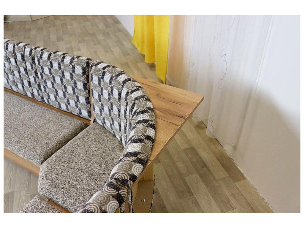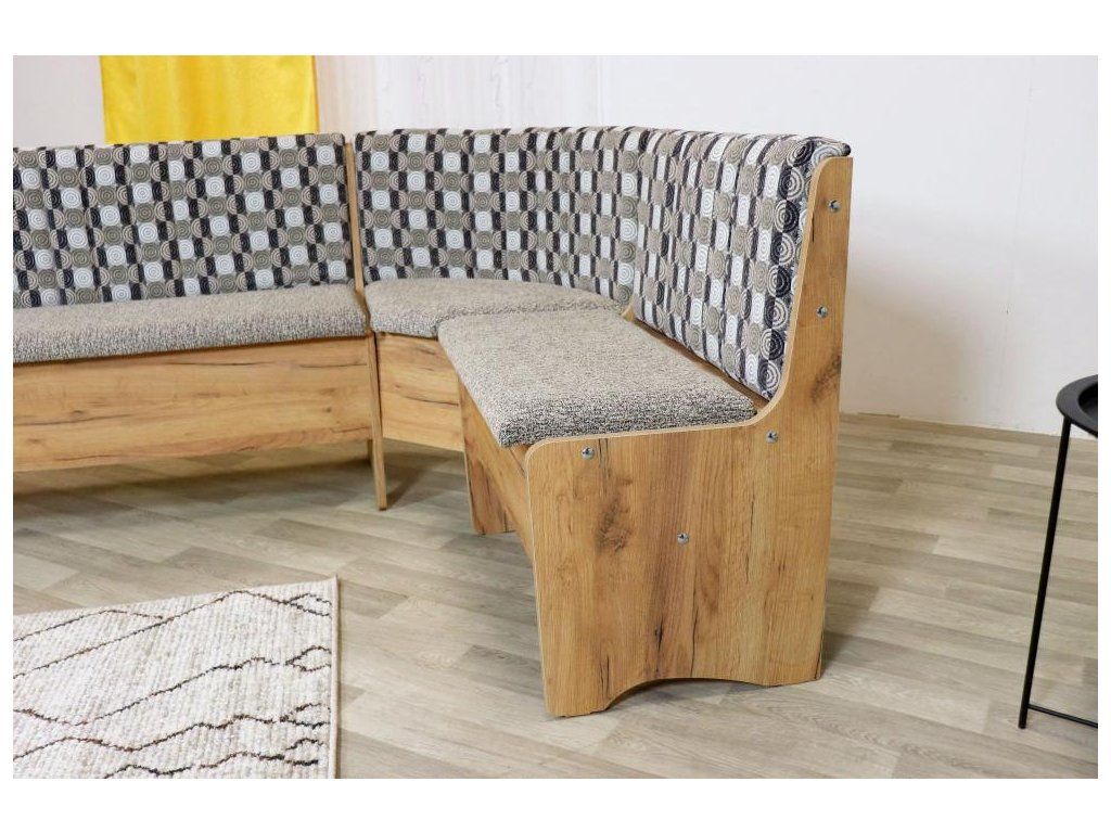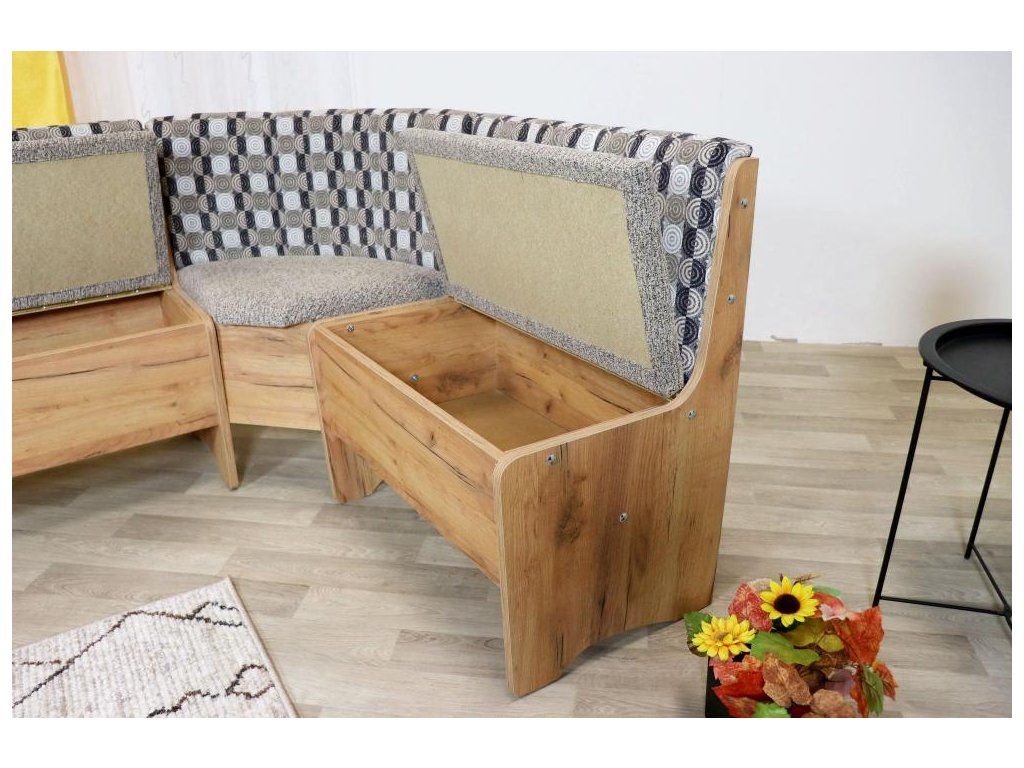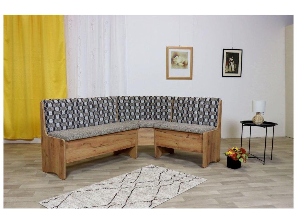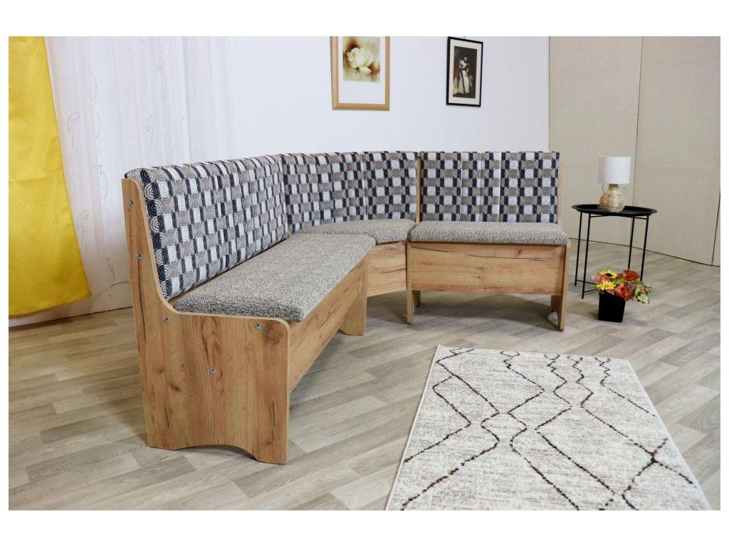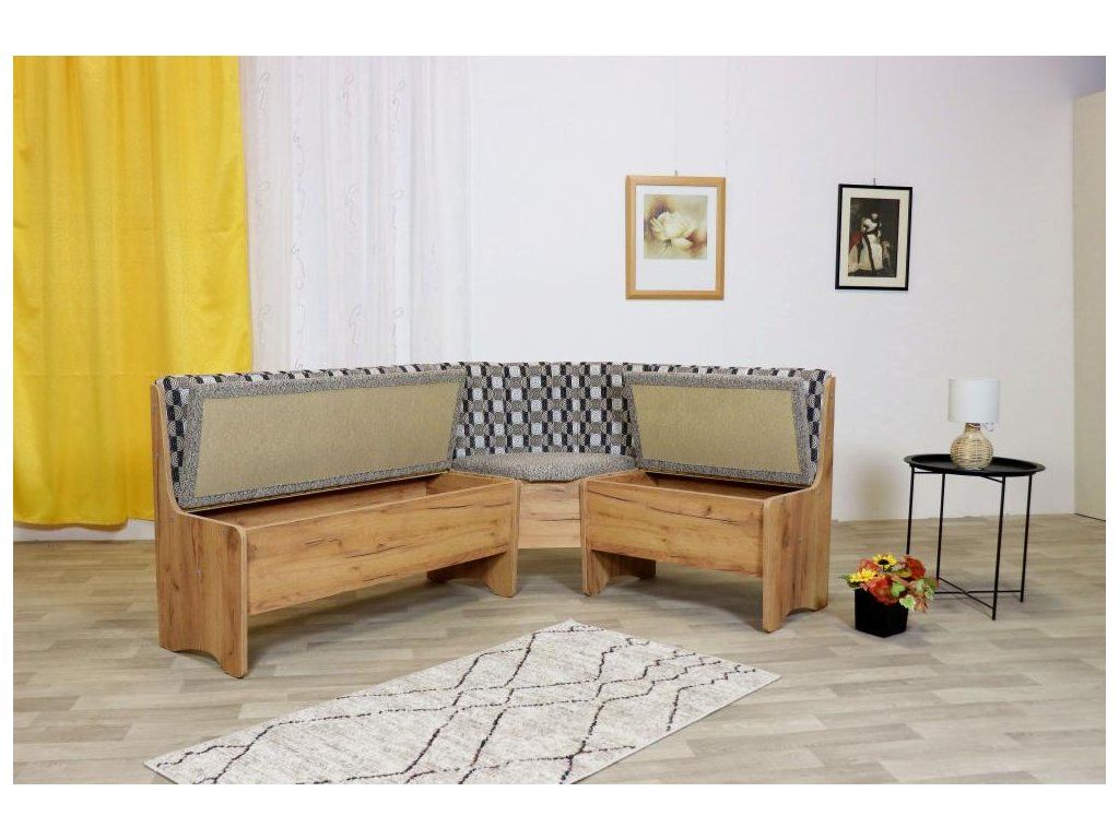 Jednoduchá čalouněná rohová kuchyňská lavice s úložnými prostory. Povrch úložných prostorů a nohy jsou vyrobeny z lamina.  Kostra lavice je tvořena kombinací masivu a velkoplošných materiálů. Čalounění je tvořeno PUR pěnou.