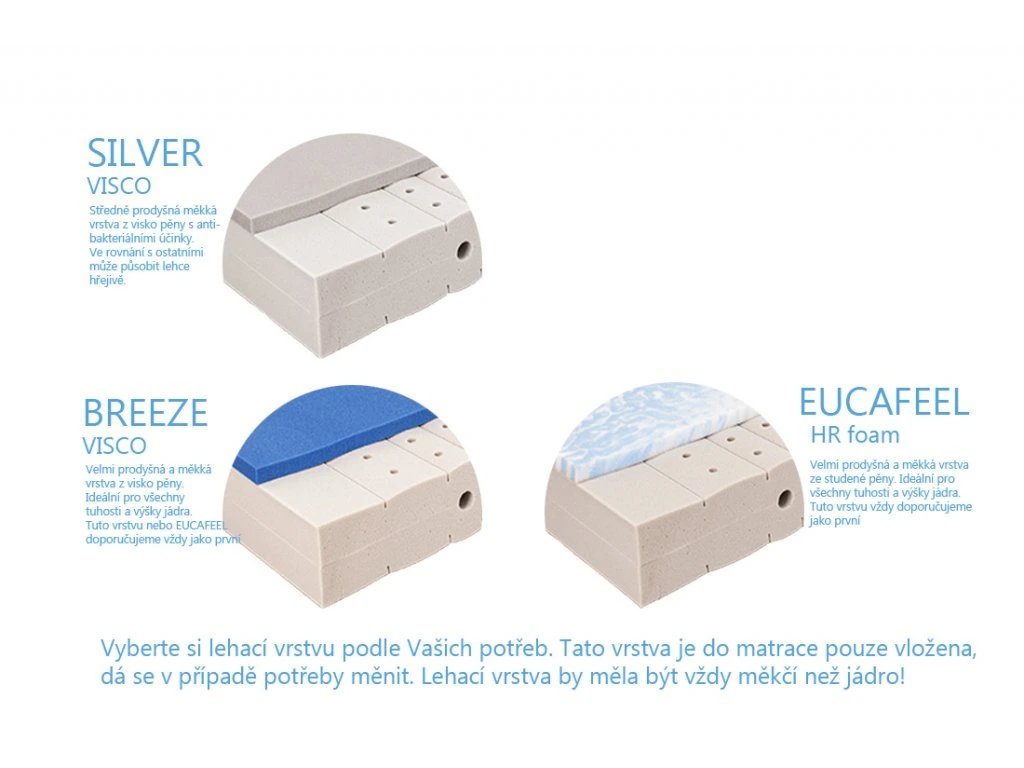 - Lehací vrstva: možnost volby mezi HR studenou pěnou, viskoelastickou pěnou a antibakteriální pěnou