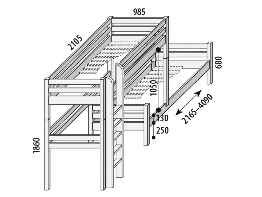 Palanda s posuvným spodním lůžkem je ideálním řešením pro malé pokoje, šetří místo a nabízí možnost volby mezi svislým a šikmým žebříkem. Má rozměry postele 90 x 200 cm a variabilní uspořádání.
