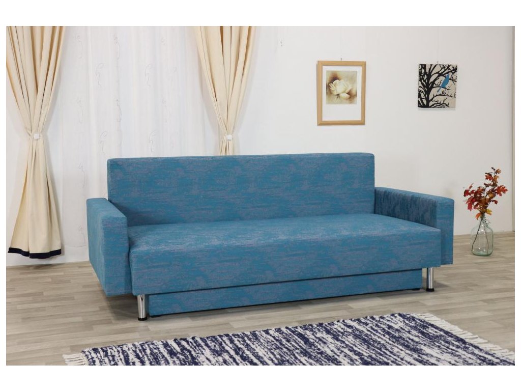 Celočalouněná rozkládací pohovka s úložným prostorem a se dvěma polštáři. Pohovka je k dostání jak bez područek tak s područkama.